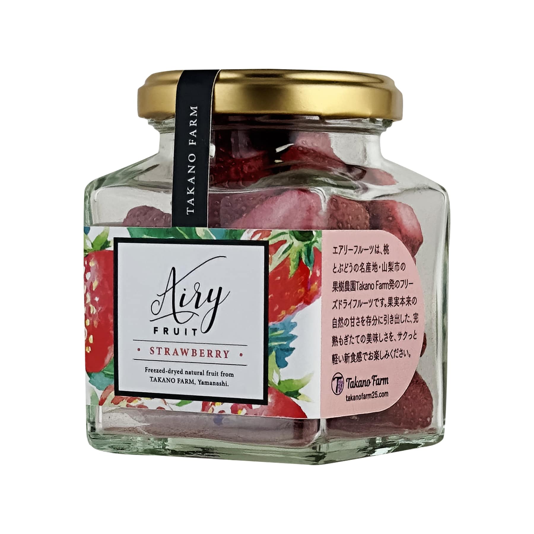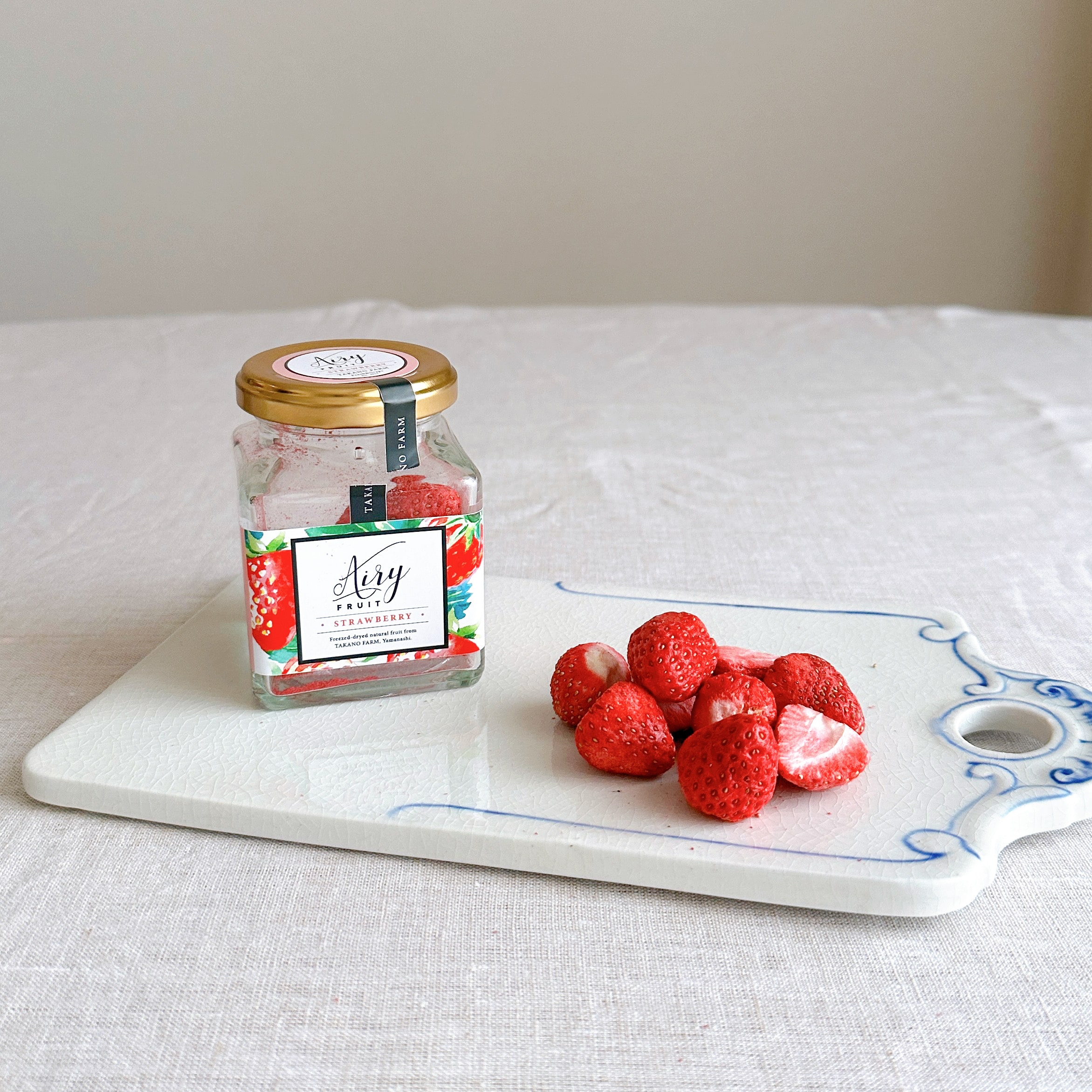製法にもこだわりが。通常、フリーズドライ製法は「ゆっくり冷凍&早く乾燥させる」のですが、フルーツの風味と鮮度を最大限にキープするため、急速冷凍し通常より長い3日間かけて乾燥させています。 そのおかげで、このエアリーフルーツを食べた同業のフルーツ農家さんから「本当のいちごの香りと味がする!」とびっくりされるそうです。