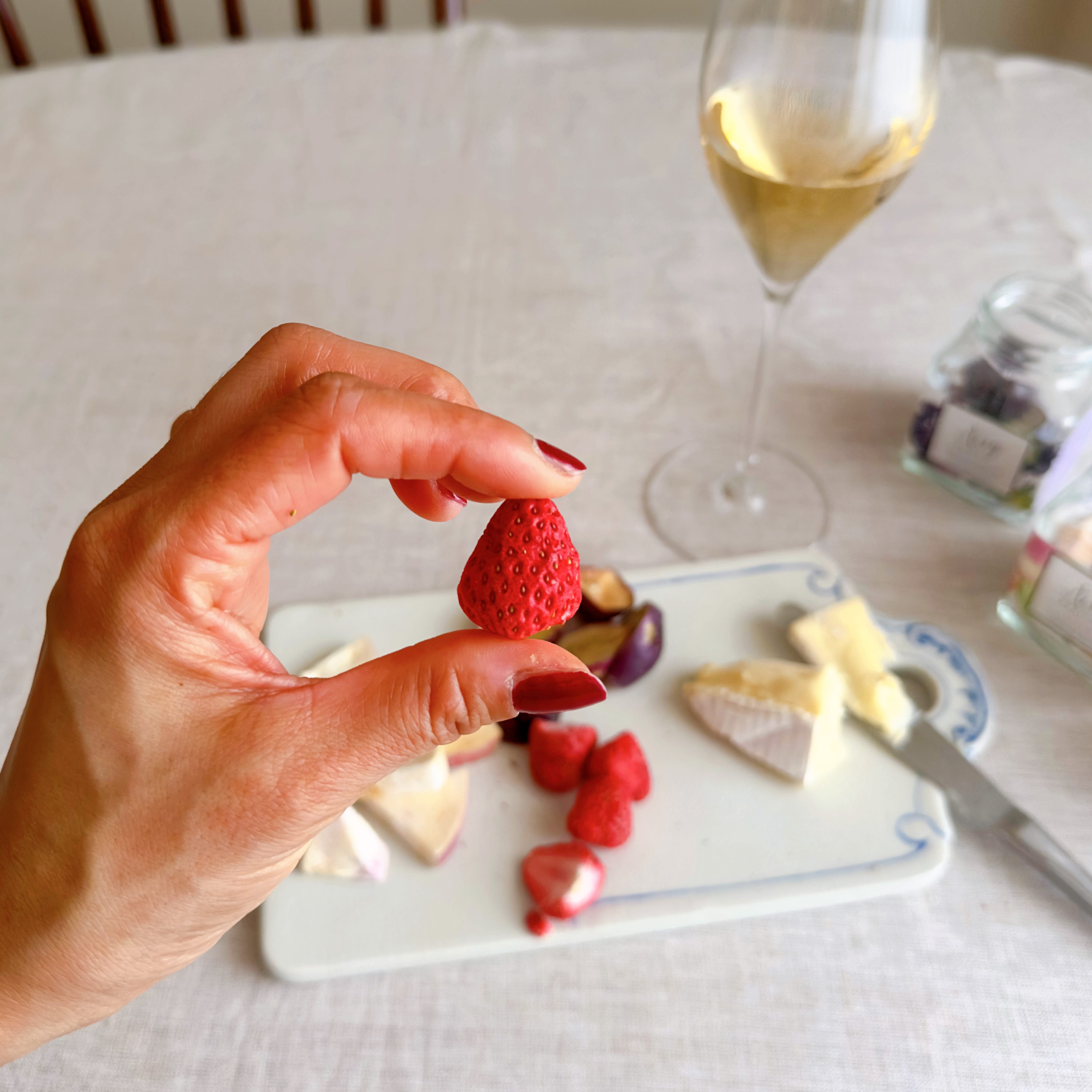 チーズに載せると簡単でお洒落なワインのおつまみに。 果物の風味は存分に感じつつ、エアリーフルーツに全く水気がないので、チーズやクラッカーがふやけてしまわないのも嬉しいポイントです。 また、簡単に細かく砕くことができるので、チーズの上にエアリーフルーツパウダーを散らすようにアクセントとして使うこともできます。