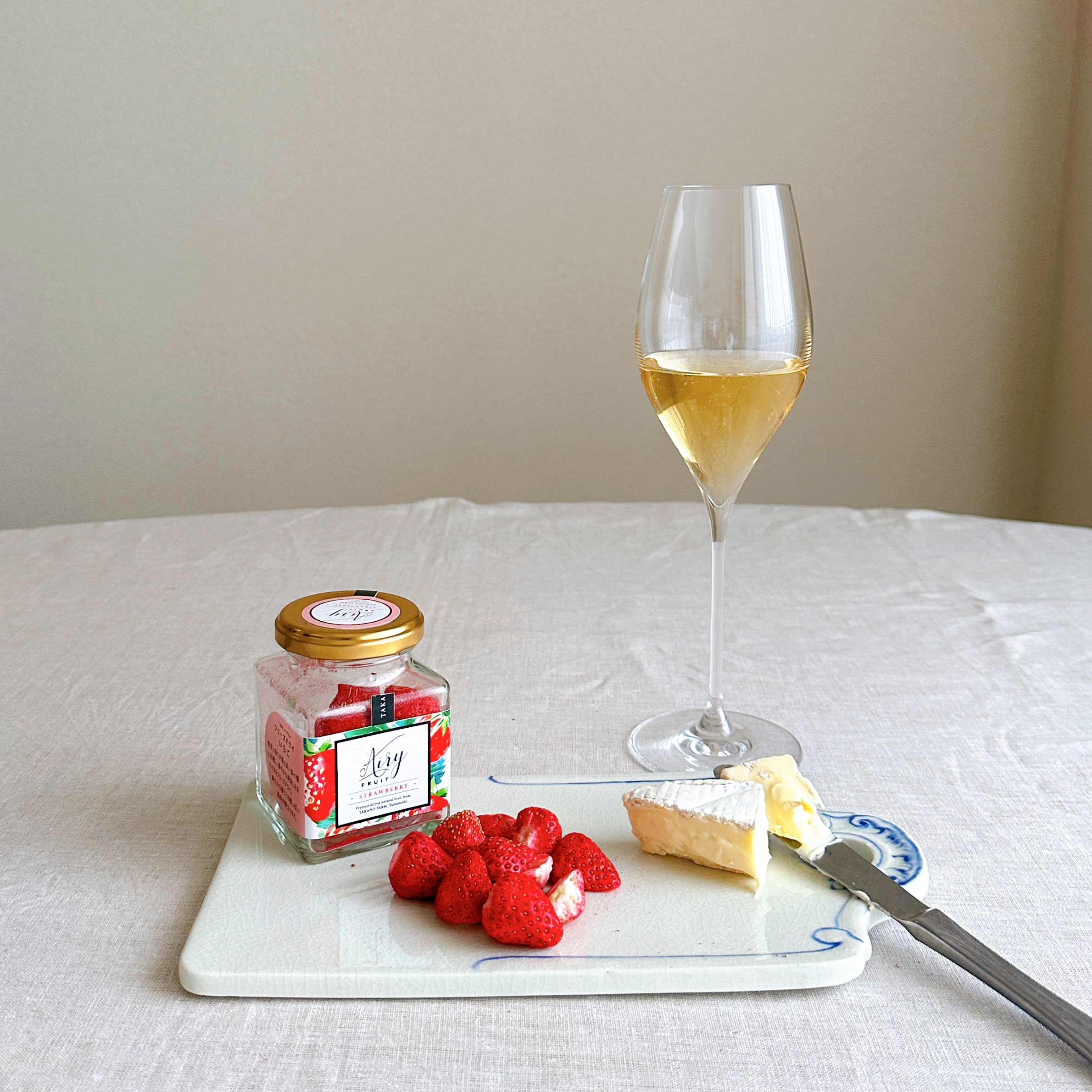「エアリーフルーツ いちご」は、白ワイン、ロゼワイン、赤ワイン、そしてスパークリングワインとどんなワインとも相性が抜群。 そのままをつまみながらワインを飲むのはもちろん、エアリーフルーツをワインに浮かべて楽しむのもおすすめです。