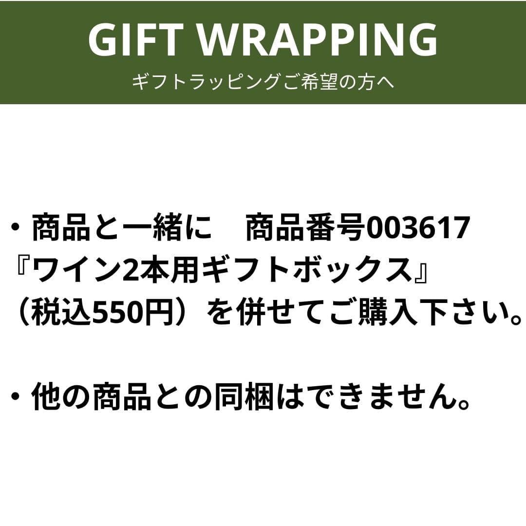 ラッピングをご希望の際は下記バナー、または「カートにいれる」ボタン下にあるバナーから、ワイン2本用ギフトボックスを一緒にご購入ください。