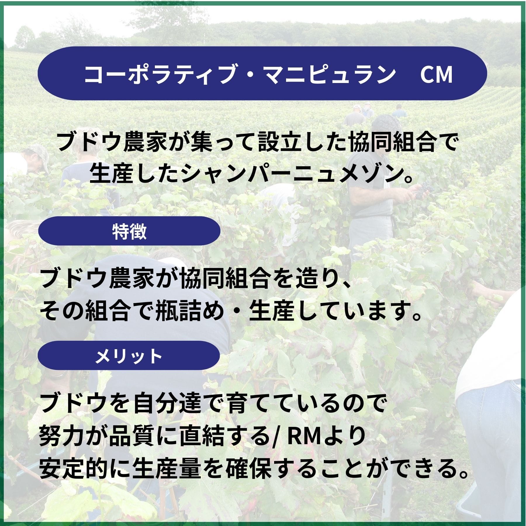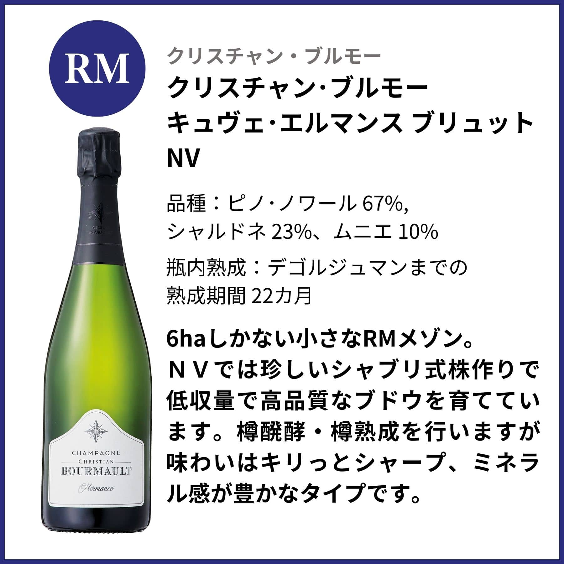 シャンパーニュ地方ではワイン生産者はフランス語で「家」を意味する「メゾン」という名前で呼ばれており、メゾンの生産業態によって分類されます。 契約農家からの買いブドウから生産(ネゴシアン・マニピュラン)、ブドウ栽培から生産まで自社で生産(レコルタン・マニピュラン)、そしてブドウ栽培農家が共同で生産する共同組合(コーポラティブ・マニピュラン)。3つの異なる業態のメゾンで造られたシャンパーニュを飲み比べることができるセット。 どの業態が一番優れている、という優劣はありません。それぞれに特徴と個性があるので、それを実際に体感していただけたらという想いで作ったセットです。