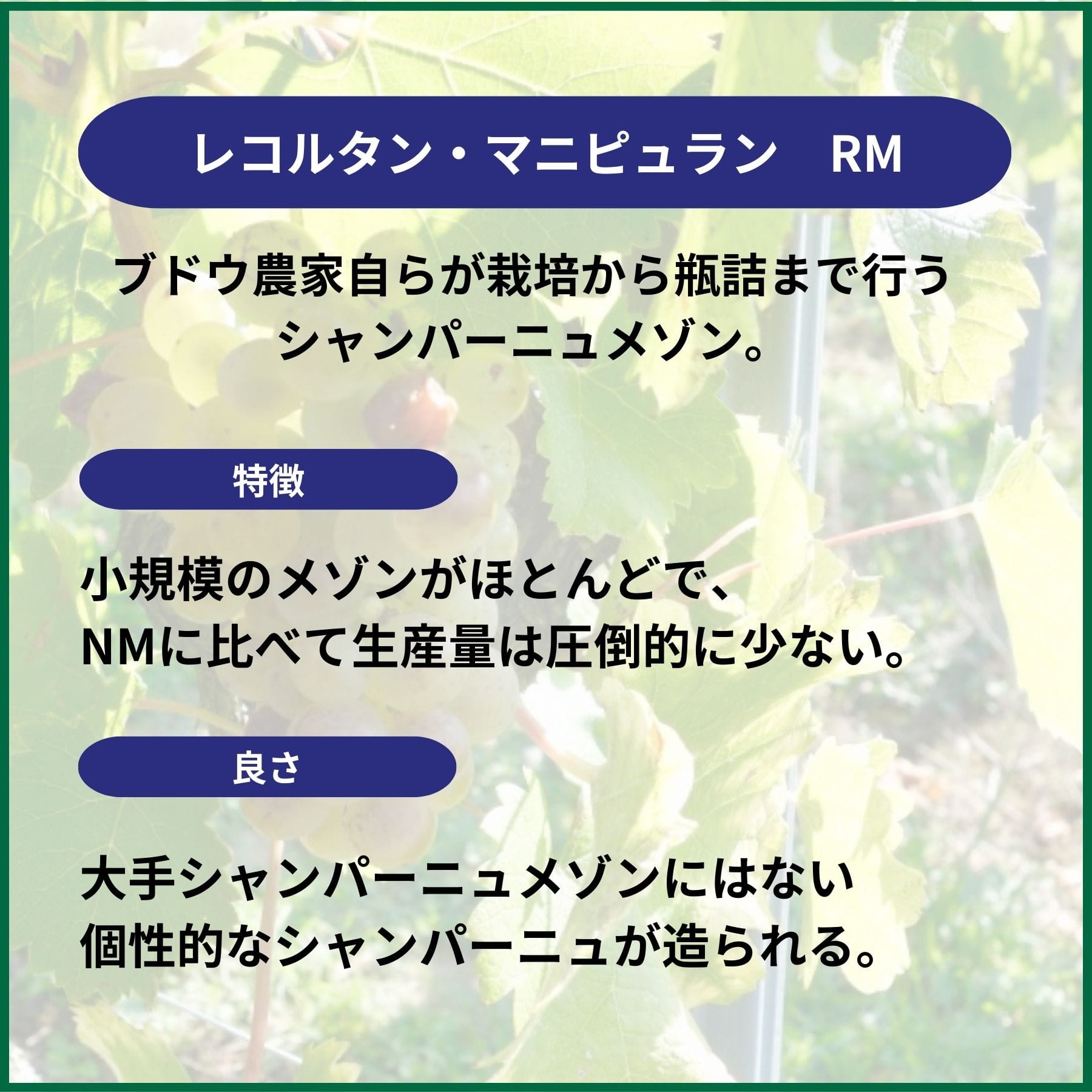 シャンパーニュ地方ではワイン生産者はフランス語で「家」を意味する「メゾン」という名前で呼ばれており、メゾンの生産業態によって分類されます。