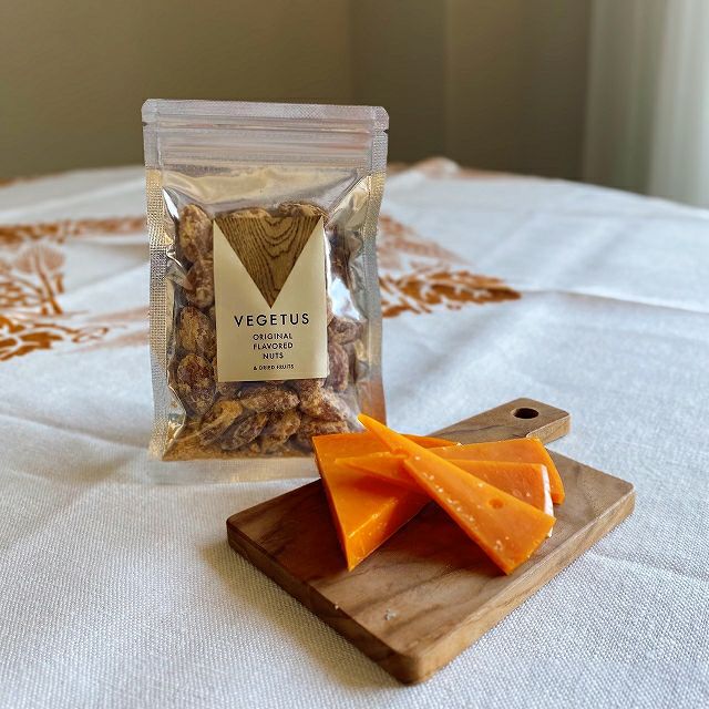 からすみだけだと生臭さが出てしまいワイン合わせるのが難しいですが、ミモレットがうまい具合にその部分をコーティングしてくれている絶妙な組み合わせ。 口に広がるミモレットの香りに余韻に残るからすみの塩味と、アーモンドの軽やかな触感が重なり合って、食べる手が止まらなくなるフレーバーナッツです。