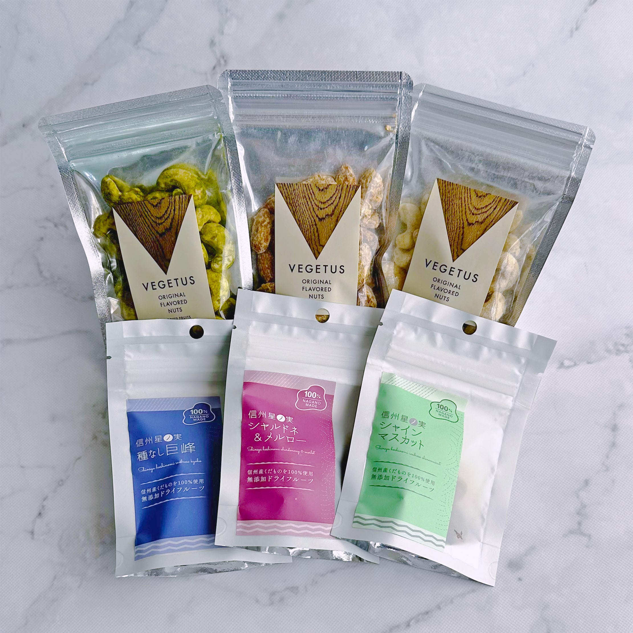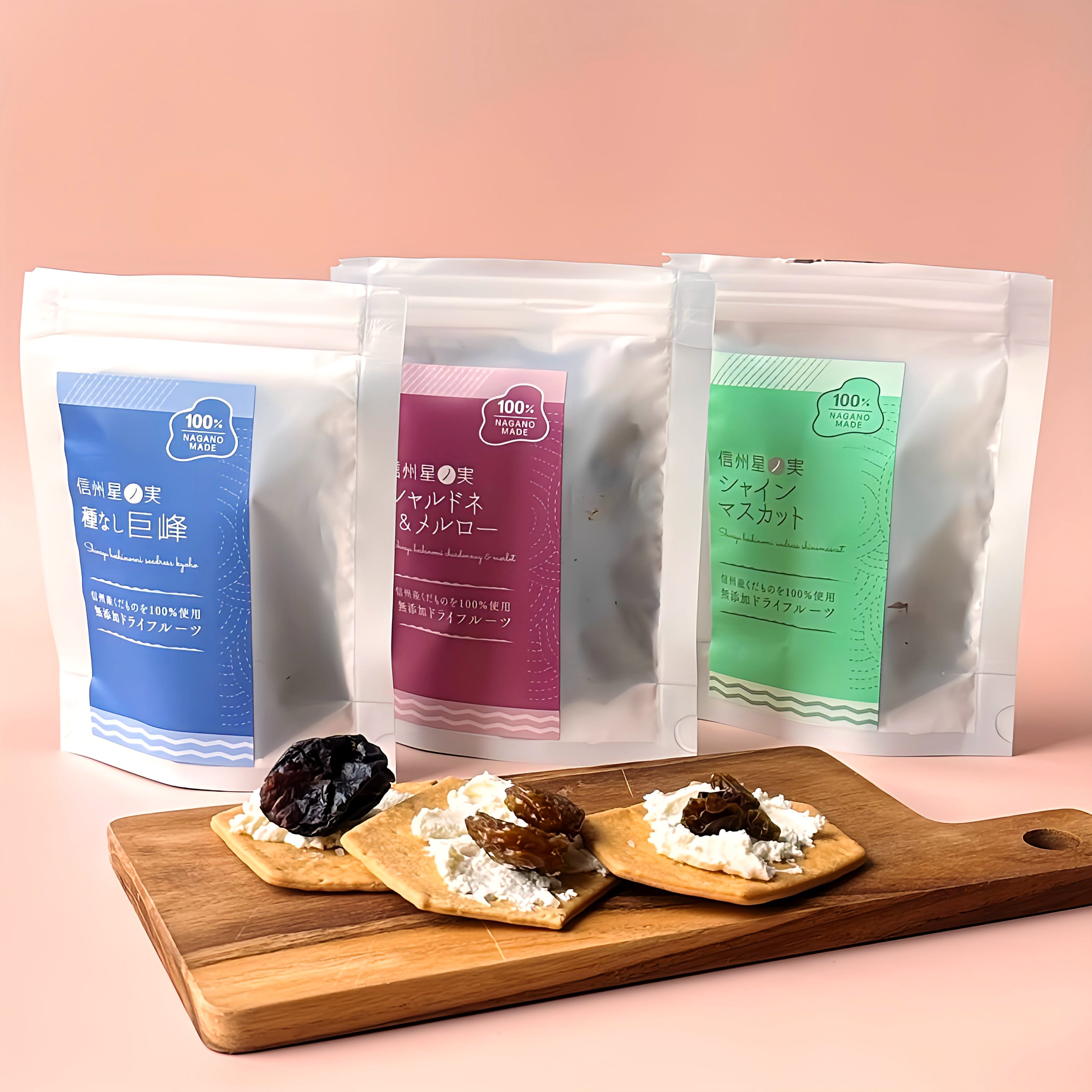 品質の高い長野産のフルーツにこだわって丁寧に作られた信州星ノ実のドライフルーツ。 オイル、砂糖、保存料、着色料などの添加物を一切使用せず、凝縮した果物の優しい甘みが感じられます。 「シャルドネ・メルロー」「シャインマスカット」「巨峰」の3種が一袋づつ入っています。