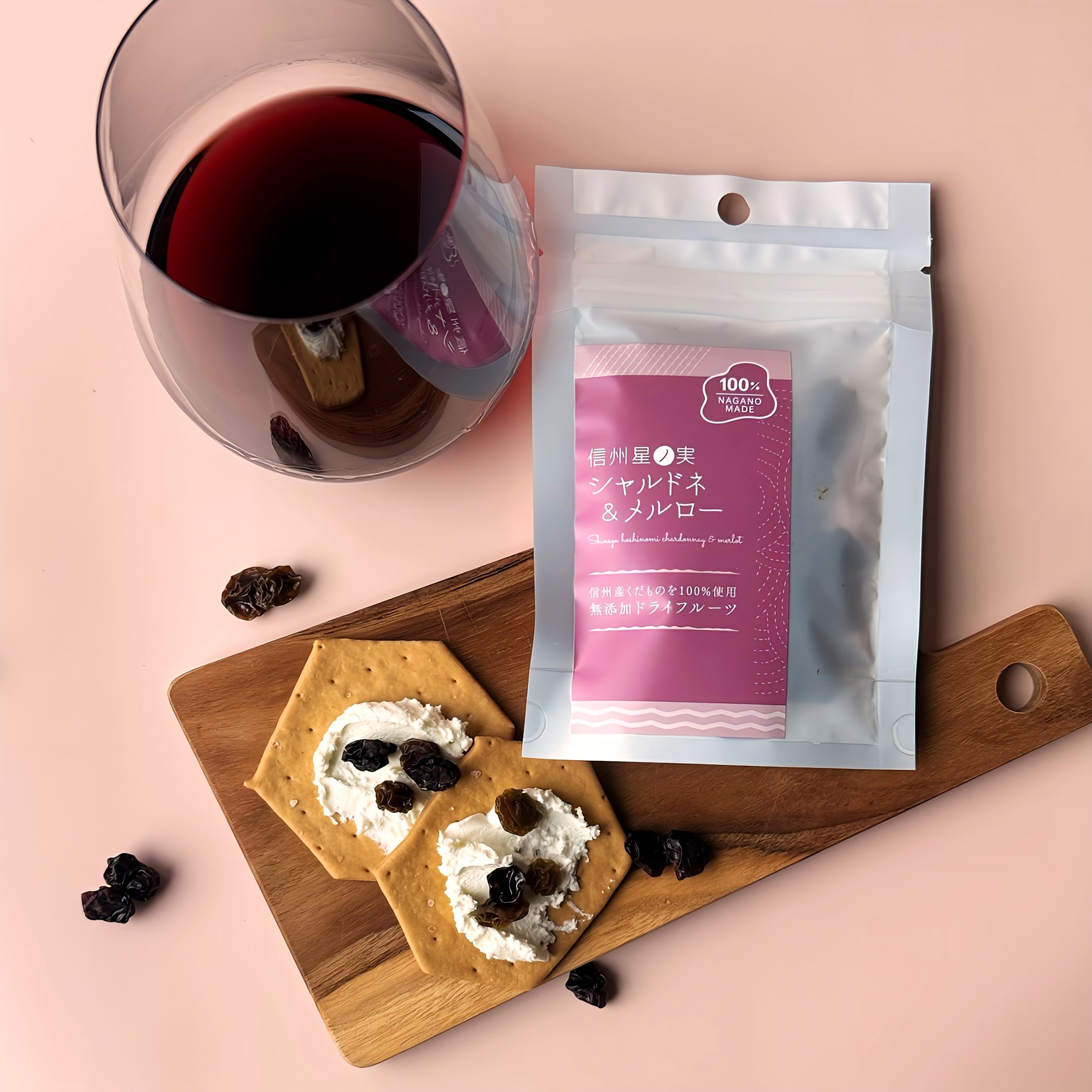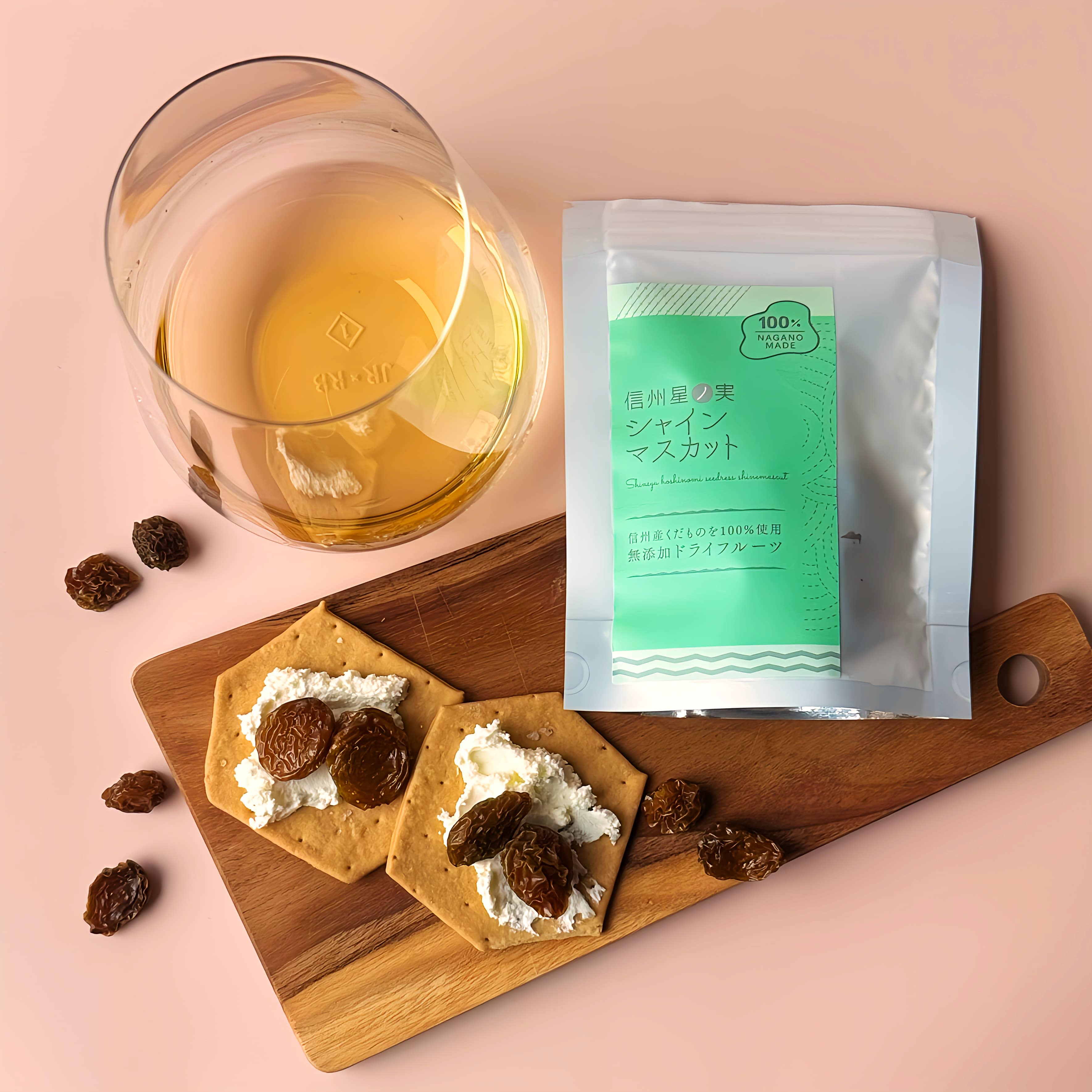 酸味と甘みのバランスが整った巨峰を、丸々一粒使って風味を凝縮させた贅沢な干しブドウ。 かみ締めるほど皮から旨味と心地よいタンニンを感じるので、赤ワインとの相性が抜群です。