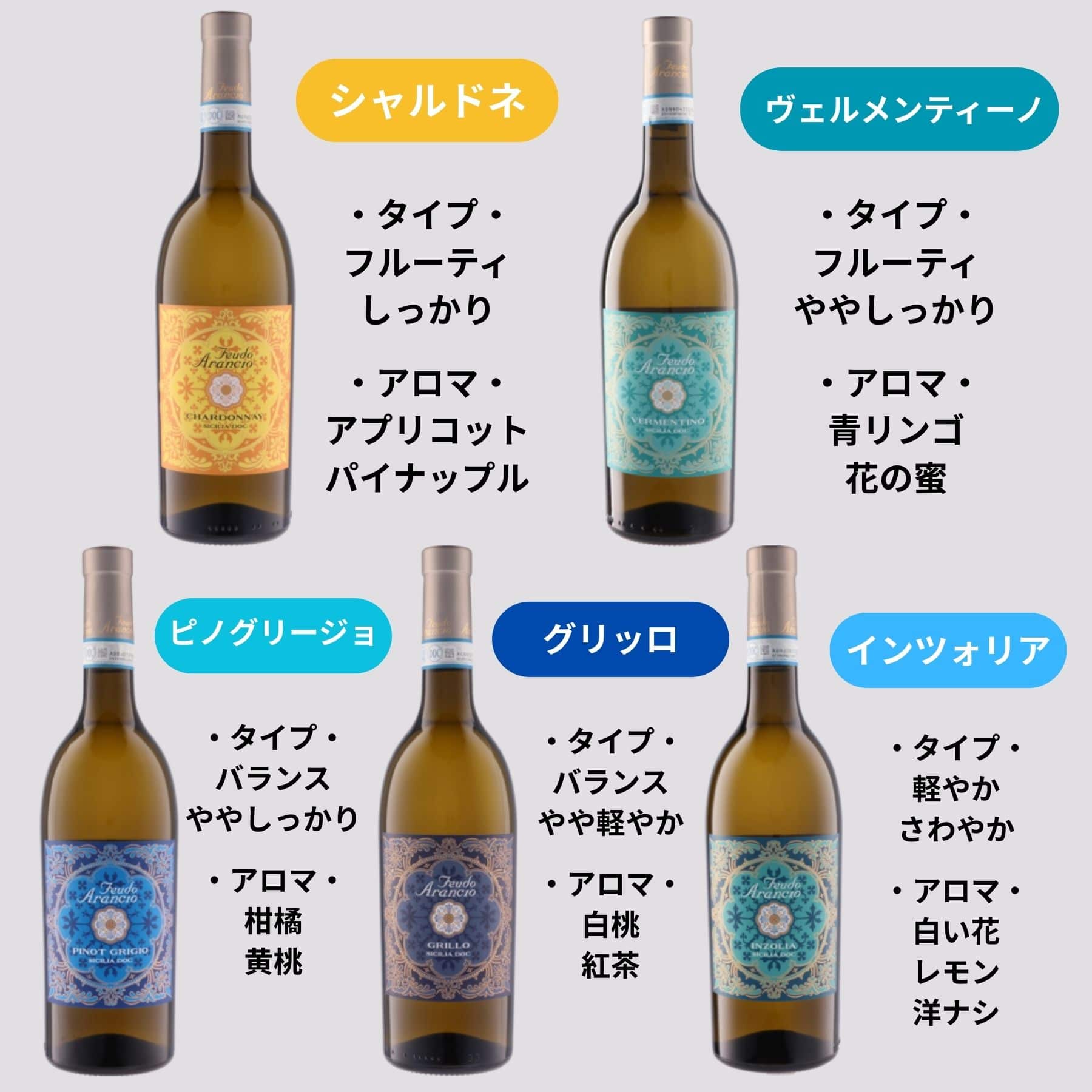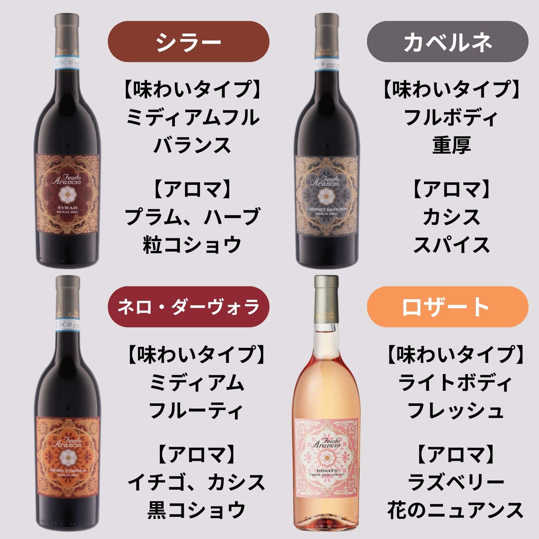 その品質は数々の受賞歴が証明しており、ベルリン・ワイン・トロフィーやムンダス・ヴィニ、モンド・セレクションなど、世界的なコンクールで数多の金賞を獲得。手頃な価格帯でありながら、評価誌や専門家から高い評価を受け続けている点は世界のカジュアルワインの中でも特筆すべき存在です。シチリアワインの実力と楽しさを、最も分かりやすく体現したシリーズと言えるフェウド・アランチョシリーズ。9種類の豊富なラインナップの味わいを分かりやすくご案内いたします。