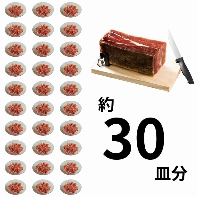 ミニ生ハム原木は800g。骨はありませんが乾燥している外側の断面部など、硬く取り除かないといけない部分もどうしても出てくるので、可食部は760gくらいです。 通常レストランで提供される生ハムは1人前の量が20~30gとされていますので、その平均「25gを1皿分の量」とした場合、このミニ原木生ハムからできる生ハムは約30皿分ということになります。