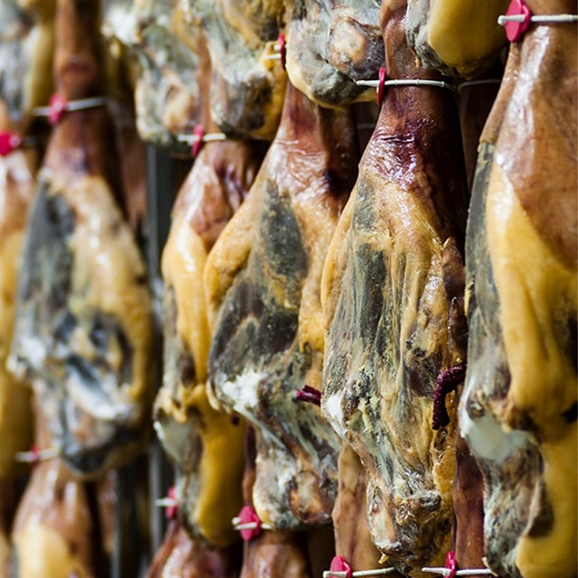 こちらのハモン・セラーノは、塩漬けにした白豚の後ろ足を、9か月以上じっくりと長い時間をかけて乾燥熟成させて作られるので、ゆっくり溶けた脂が赤身に染み込み、きめ細かな霜降りを味わうことができます。