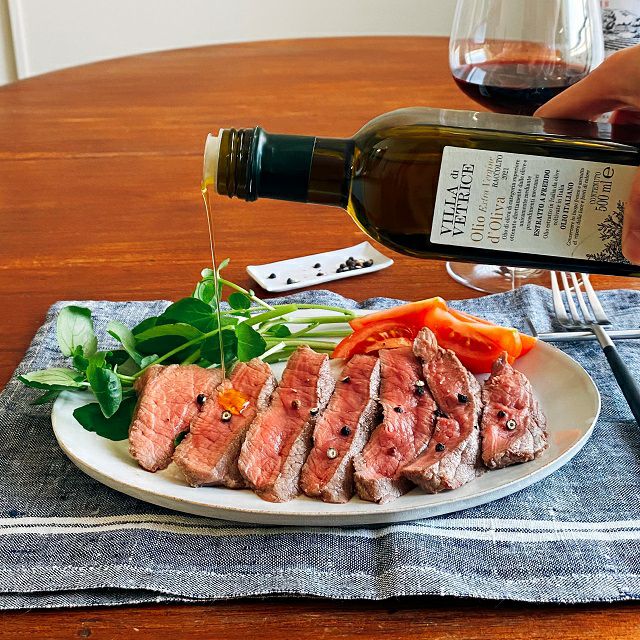牛モモ肉のような脂身の少ないお肉も、ヴィッラ・ディ・ヴェトリチェをかけると一切パサパサしません!この唯一無二の個性的な味わいを、ぜひご自宅でお楽しみください。