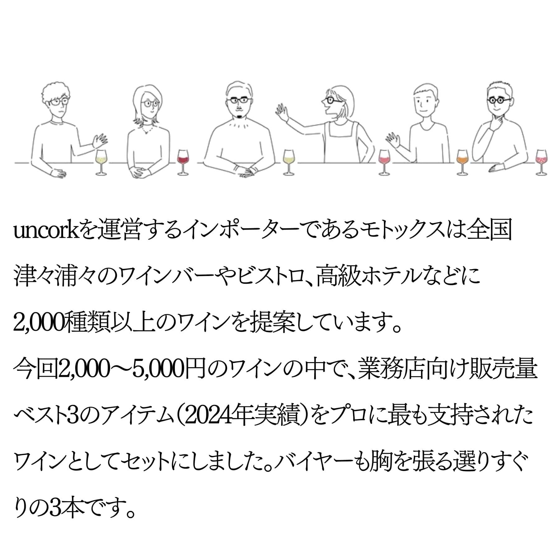 uncorkを運営するワイン輸入商社モトックスは全国津々浦々のワインバーやビストロ、高級ホテルなどに2,000種類以上のワインを提案しています。今回2,000~5,000円のワインの中で、業務店向け販売量ベスト3のアイテム(2024年実績)をプロに最も支持されたワインとしてセットにしました。バイヤーも胸を張る選りすぐりの3本です。