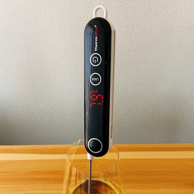 実際に飲むことを想定しているので、メーカーの検証とは違い、ワインボトルではなく「ワイングラスに注いだ状態」で温度を測っていきます。部屋の温度は20度でした(部屋の温度計の写真撮り忘れてしまいました。。。)
