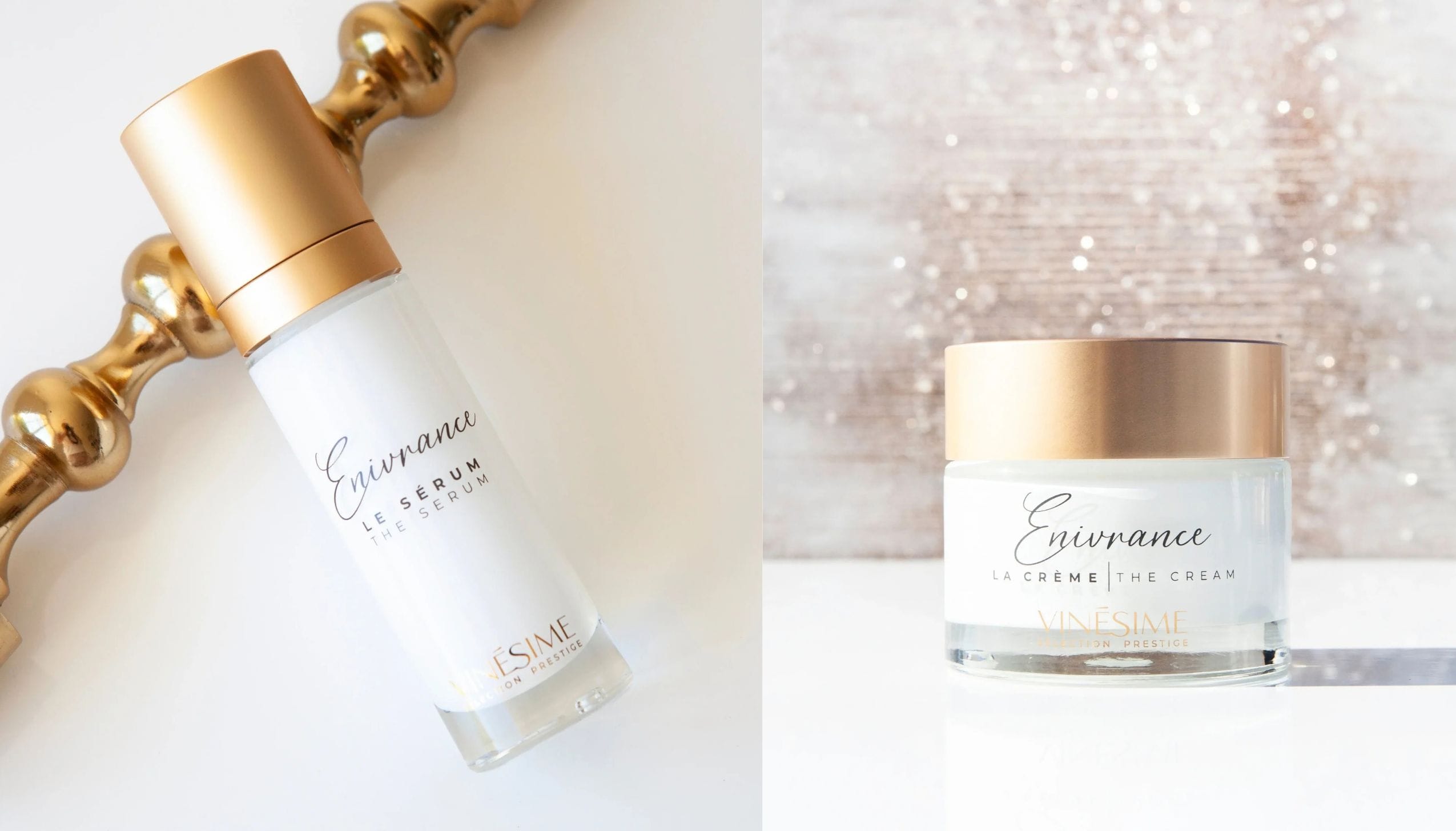 ブドウ由来の天然成分を活かしたスキンケアブランド【Vinesime ヴィネジム】。 「エニヴランス シリーズ」は、世界中のワインラバー垂涎の歴史あるシャンパーニュメゾンとの共同開発によって生まれた高濃度シャンパーニュエキス配合のラグジュアリーなスキンケアシリーズです。原材料となるぶどうは、シャンパーニュの名門メゾン「ランソン」と「ボランジェ」のもののみを使用。 シャンパーニュ地方のぶどう花エキスと、アルプスの高山植物エキスなど、最先端の植物研究による有効成分が、肌にふっくらとしたハリと透明感のあるツヤを呼び覚まします。